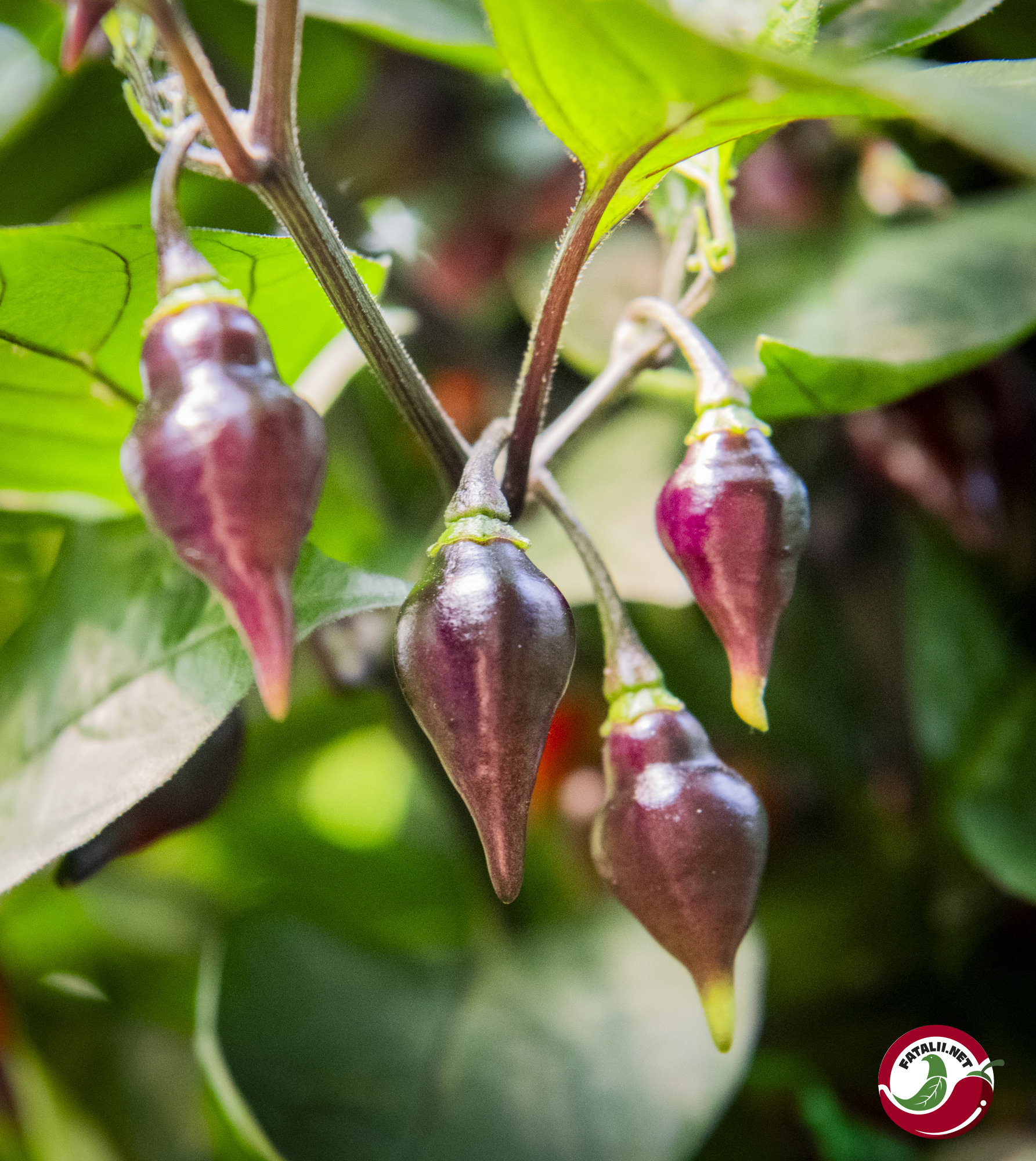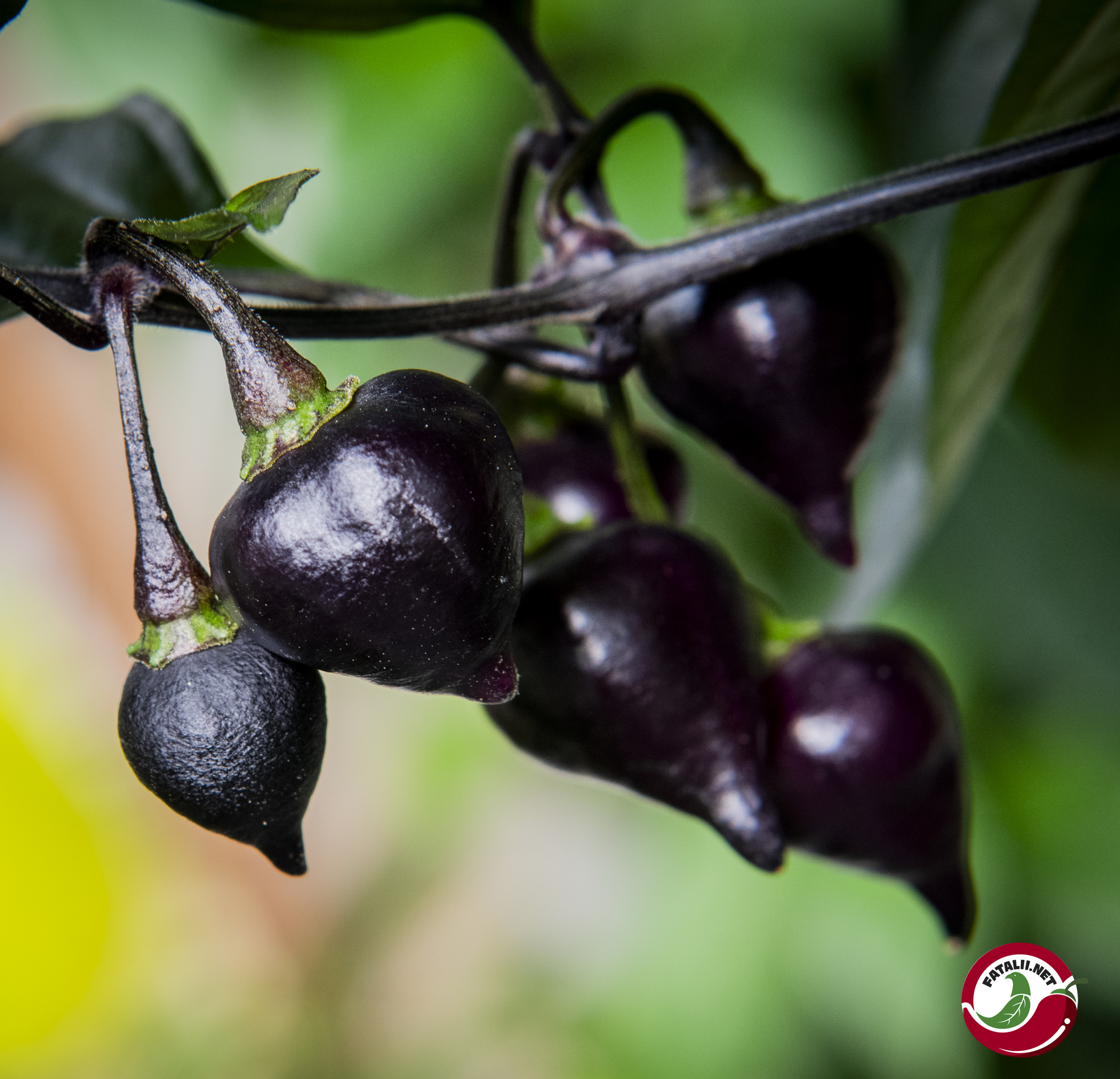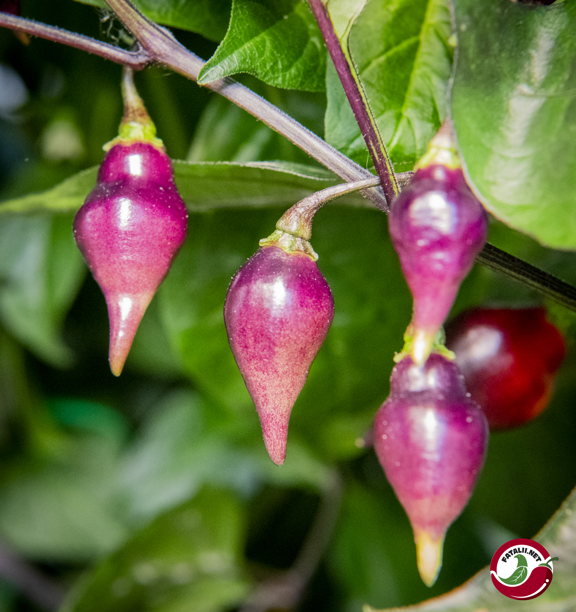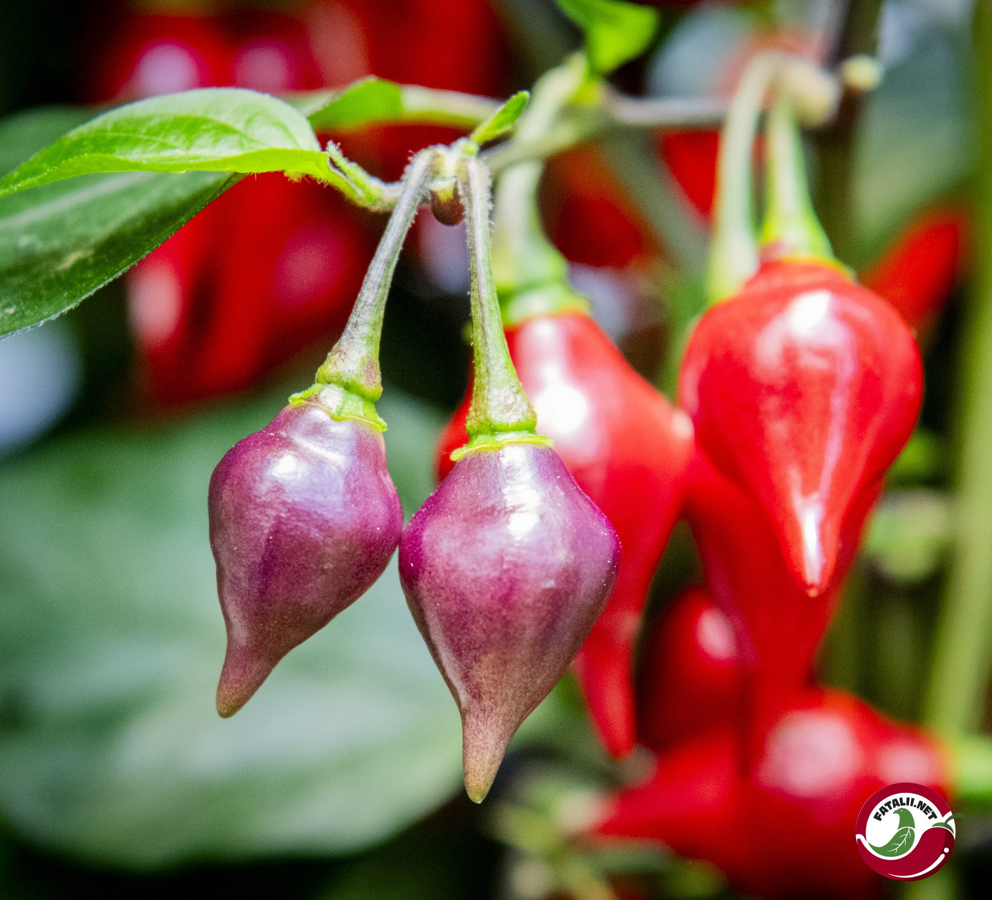 Chupetinho Black is a strikingly beautiful chili variety that starts with deep green or black pods and goes through an impressive color transition. As the peppers ripen, they display stunning shades of purple before fully maturing into a rich red. These small, teardrop-shaped pods grow in clusters and offer a bold contrast against the lush green foliage, making the plant a standout ornamental choice.