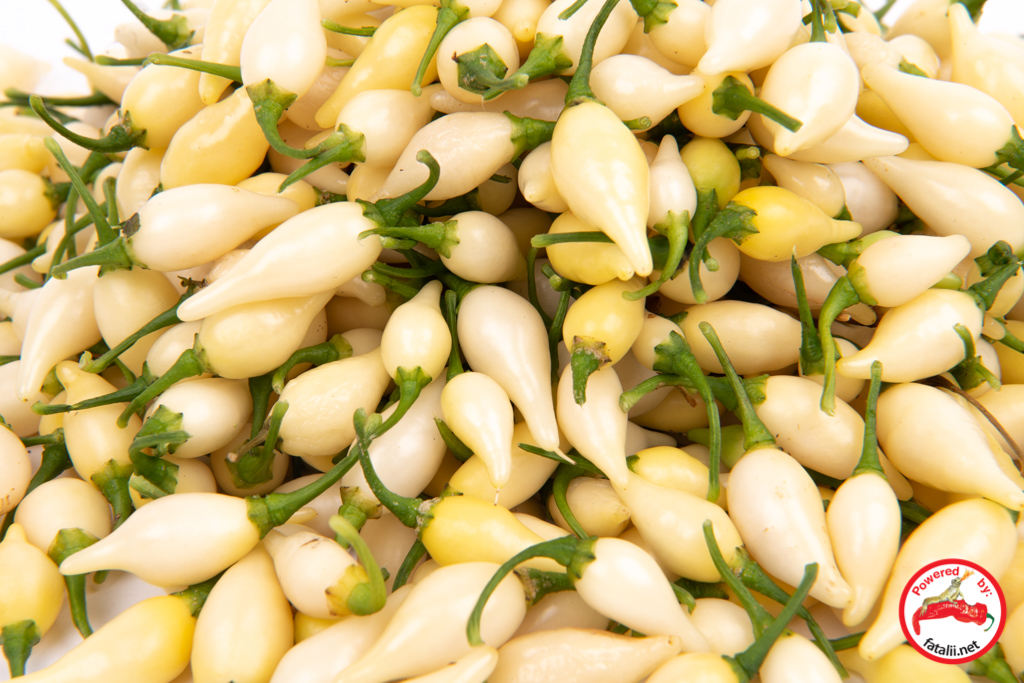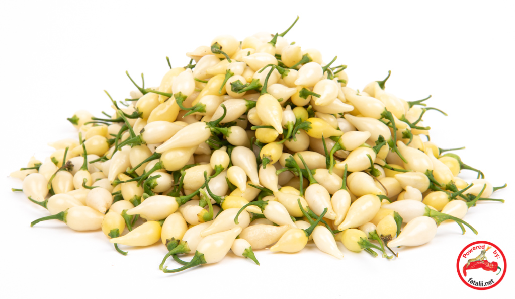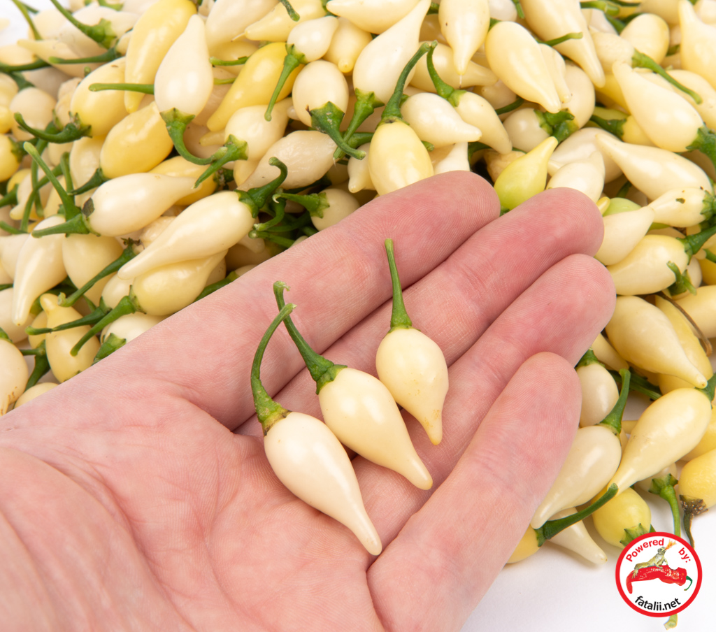 What a wonderful variety! These white, tear shaped, very aromatic and quite hot pods look absolutely astonishing! This variety can be filled with white pods. There will be literally hundreds and hundreds of pods per plant on this variety. Ideal for bonchi growing as well!