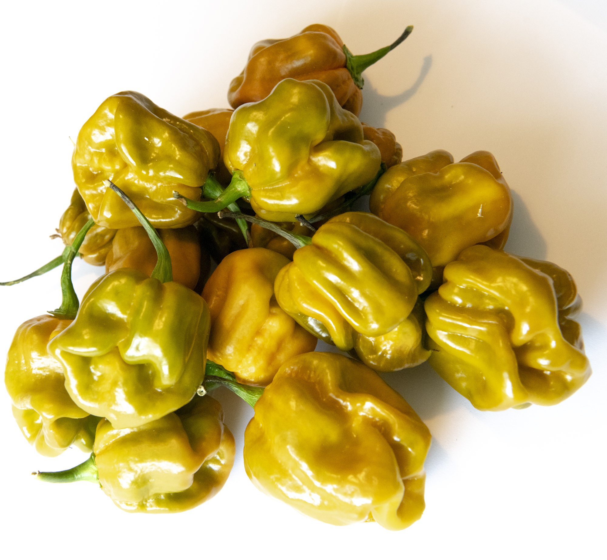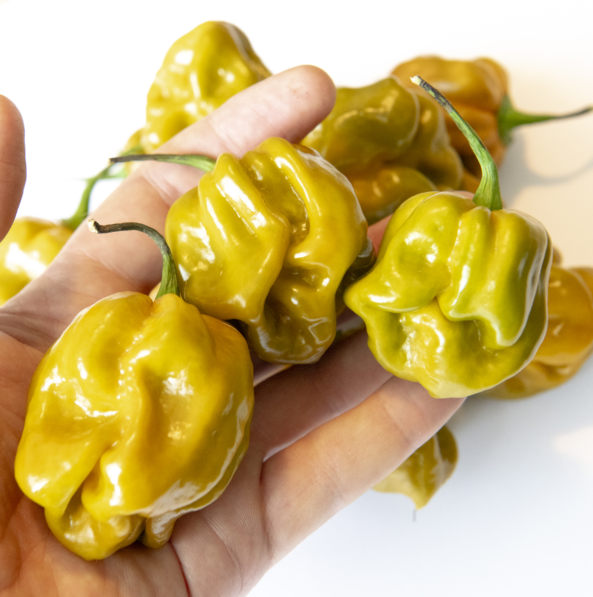 The Habanero Mustard pepper is a striking variety known for its unique mustard-yellow color and intense heat. These peppers have a distinct wrinkled texture and mature from green to a vibrant mustard hue. With a heat level typical of habaneros, they pack a significant punch, making them a favorite for those who enjoy fiery flavors.