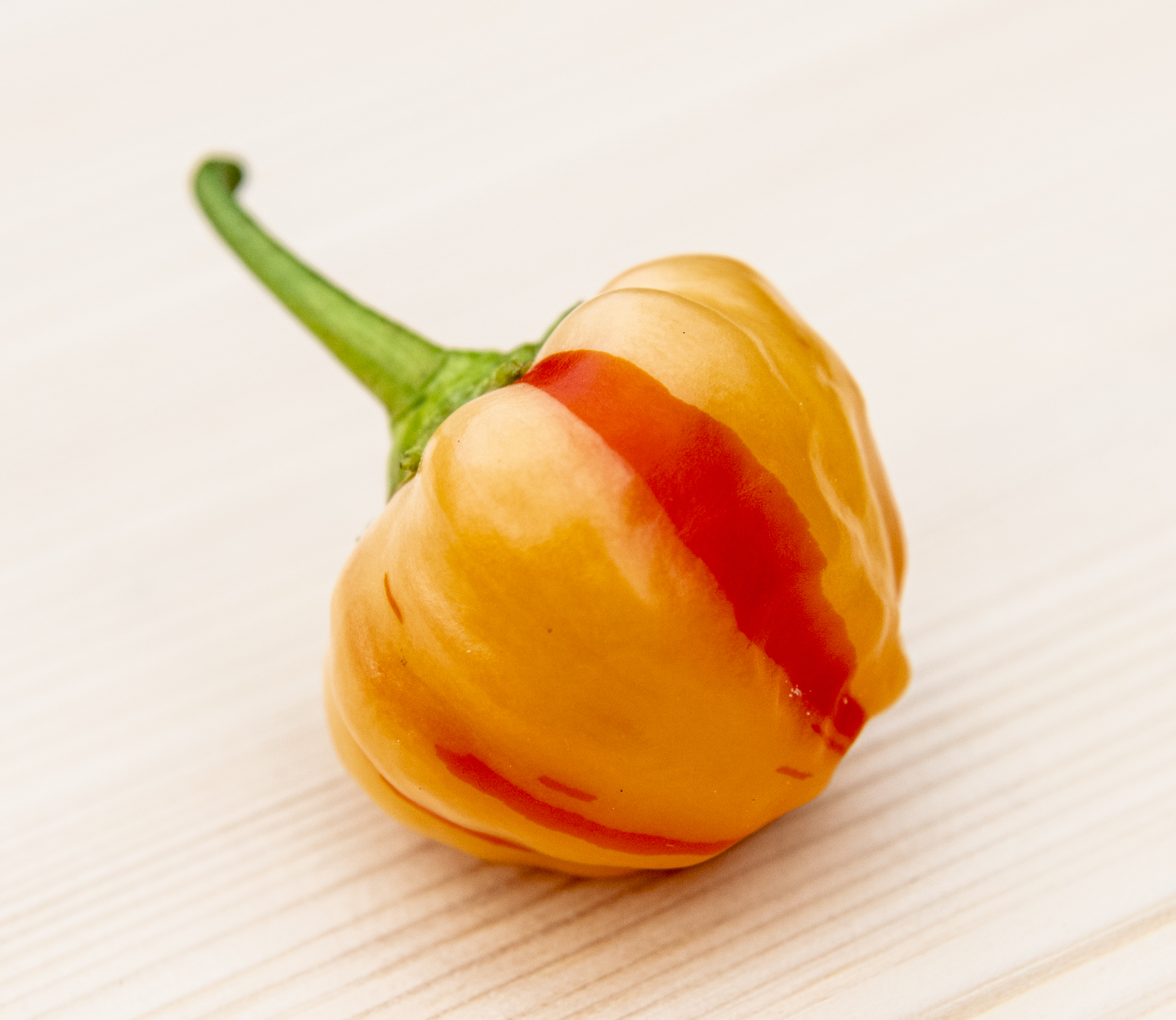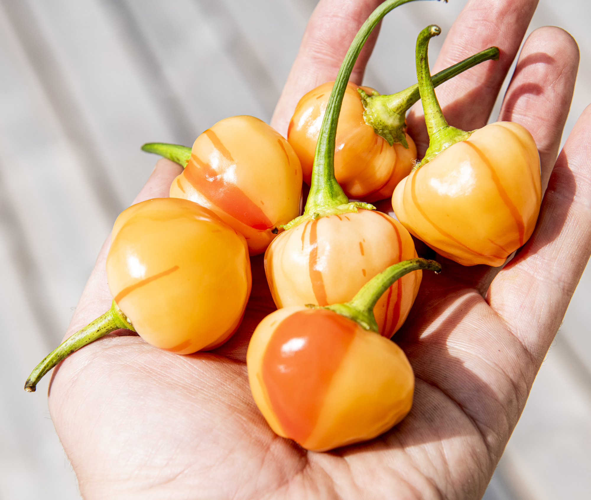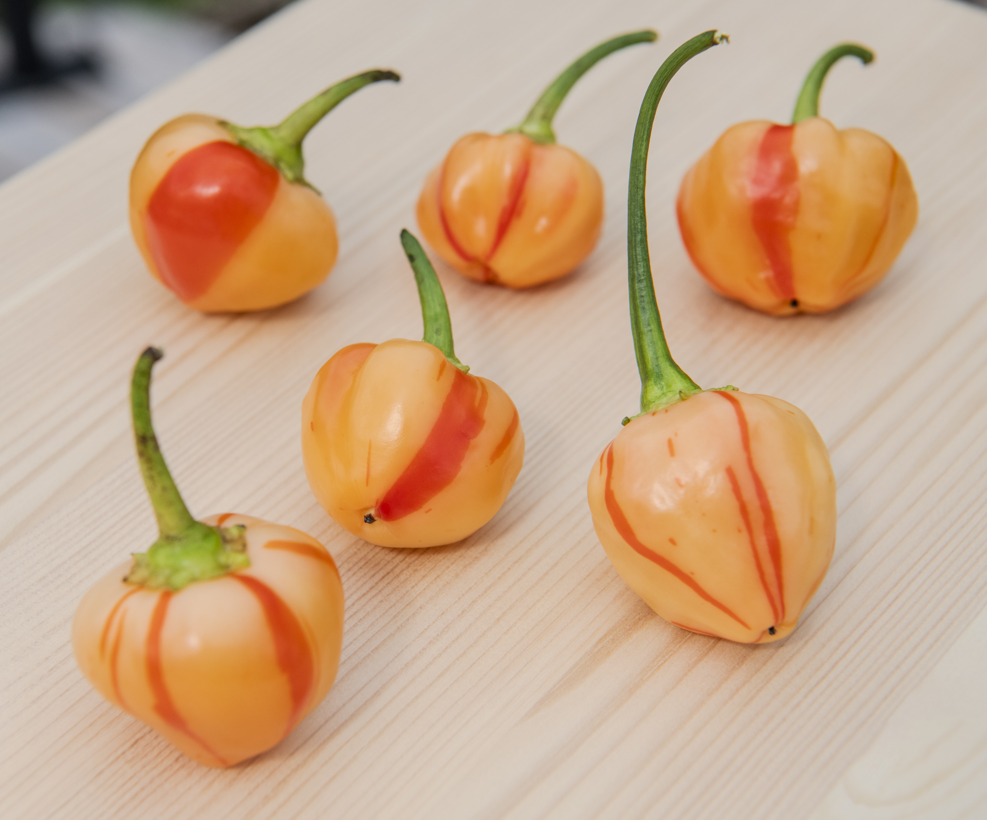 The Peppapeach Stripey pepper is a captivating variety known for its unique coloration and mild heat. This pepper features a striking appearance with its peach-colored pods adorned with red stripes and spots, making it a standout addition to any garden. Discovered in 2021, each pod has a distinct pattern, ranging from solid stripes to speckled red accents.