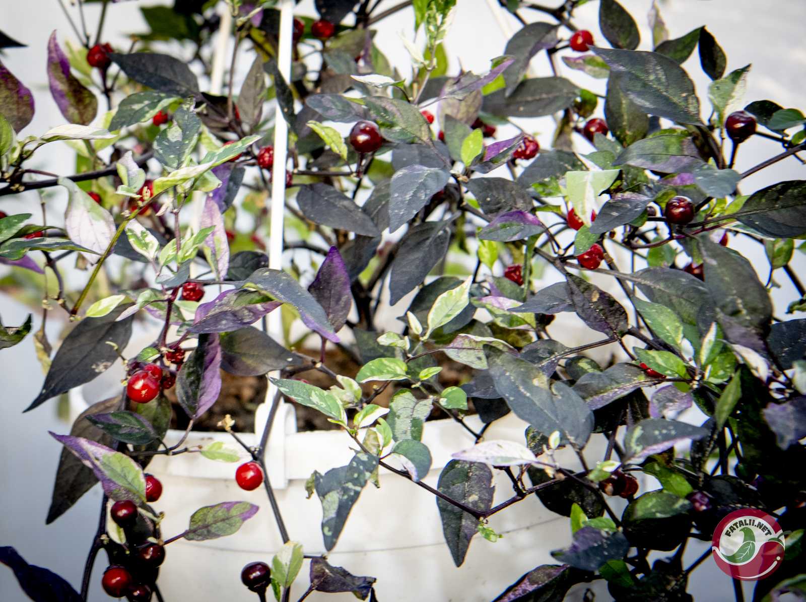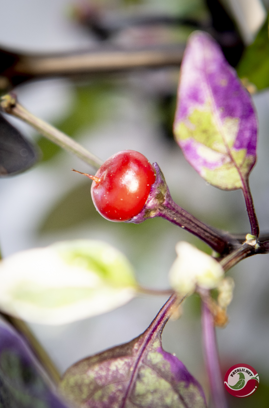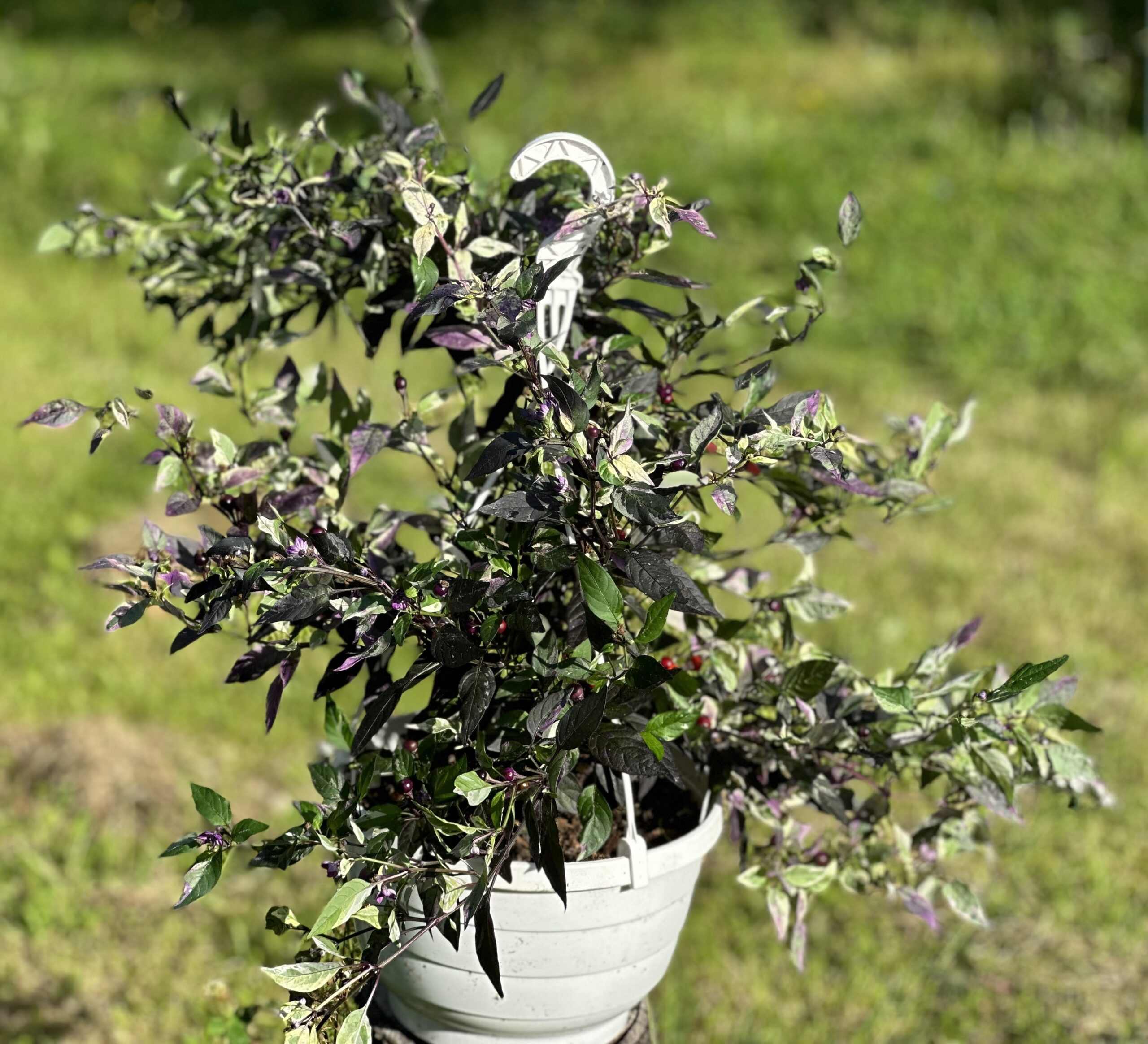 The ‘Purple Flash’ chili pepper dazzles with its dramatic variegated foliage in hues of deep purple to almost black, accented with occasional bursts of bright purple and creamy white. This ornamental beauty blooms with violet flowers, followed by edible, dark purple fruits which ripen to red, (sometimes thru lighter purples or pink accents) that carry a spicy zing, perfect for adding a sharp twist to oriental dishes. Compact and bushy, it thrives in full sun, making it as resilient as it is attractive.