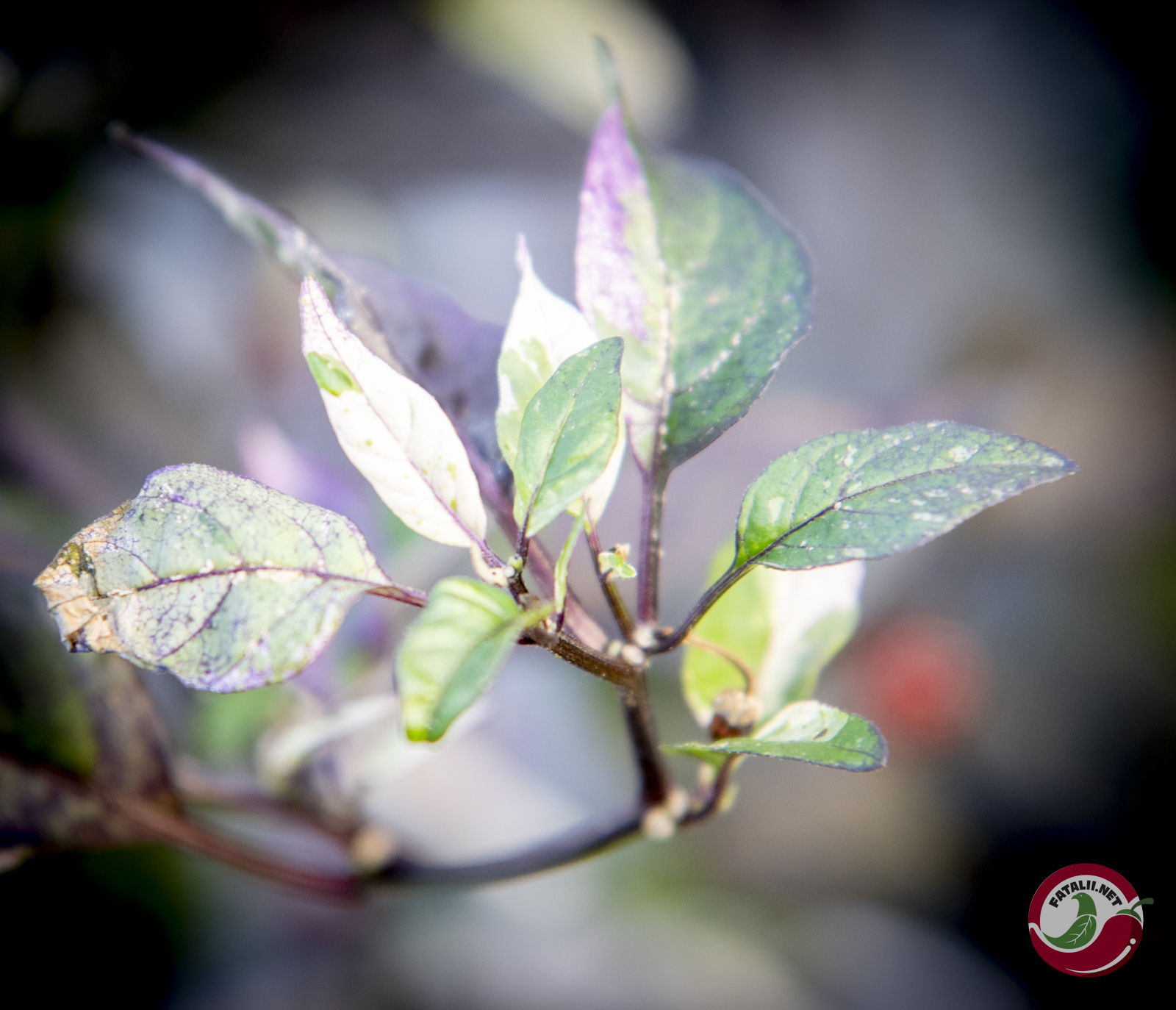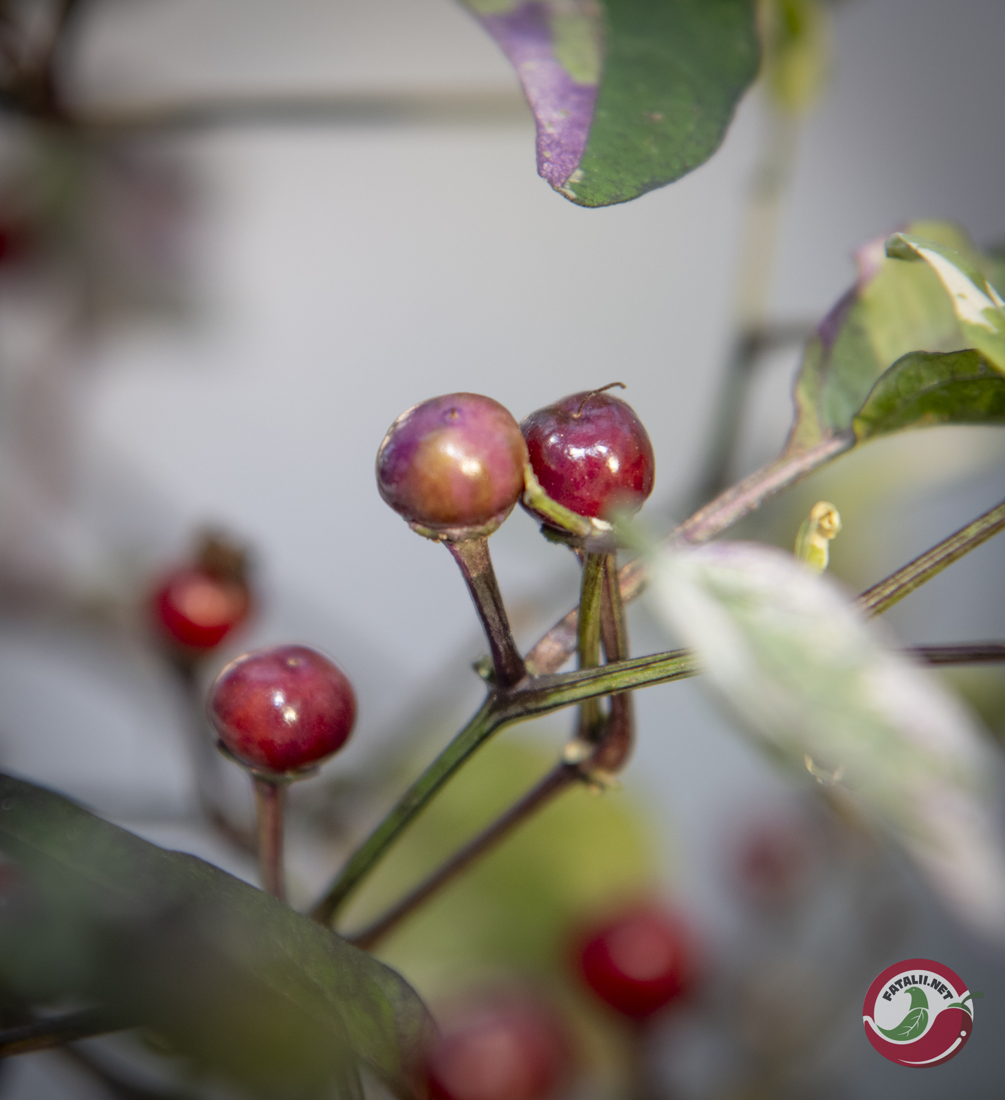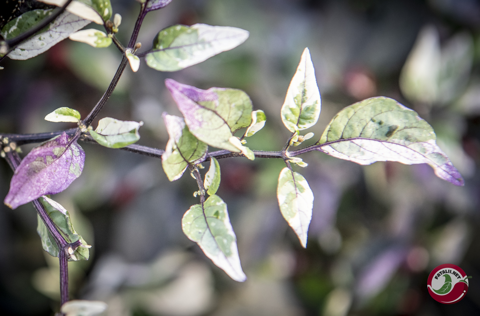 The ‘Purple Flash’ chili pepper dazzles with its dramatic variegated foliage in hues of deep purple to almost black, accented with occasional bursts of bright purple and creamy white. This ornamental beauty blooms with violet flowers, followed by edible, dark purple fruits which ripen to red, (sometimes thru lighter purples or pink accents) that carry a spicy zing, perfect for adding a sharp twist to oriental dishes. Compact and bushy, it thrives in full sun, making it as resilient as it is attractive.