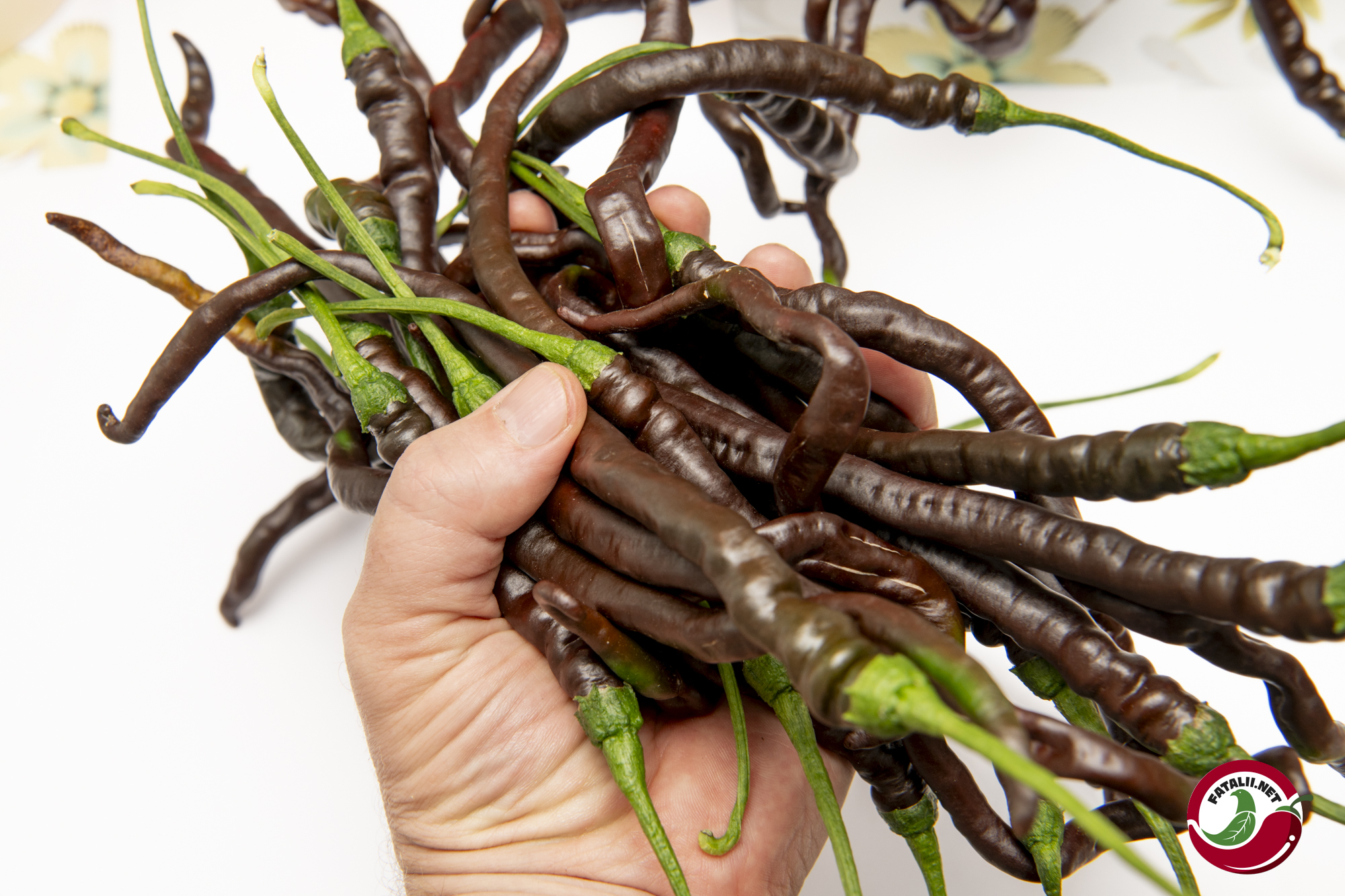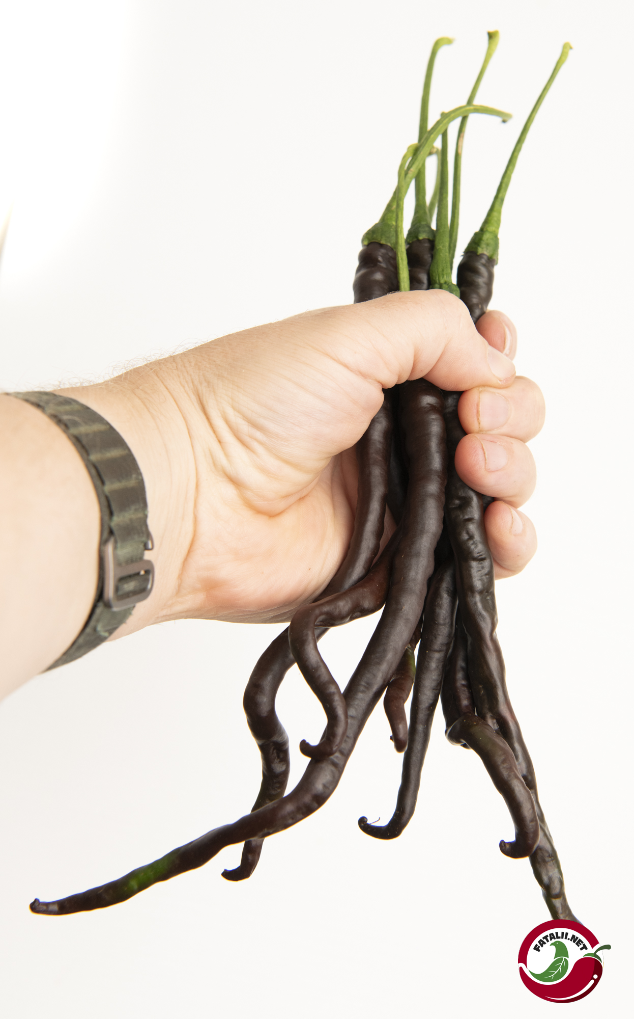 Developed by Denmark pepper grower Jes Christiansen, is an exceptional cross that resembles a long, brown, skinny Cayenne. This unique chili pepper boasts a mild to medium heat level, making it versatile for both heat enthusiasts and those who enjoy a milder kick. The fruity, smoky flavor tones enhance a variety of dishes, from sauces and stir-fries to dried seasonings, adding complexity and depth.